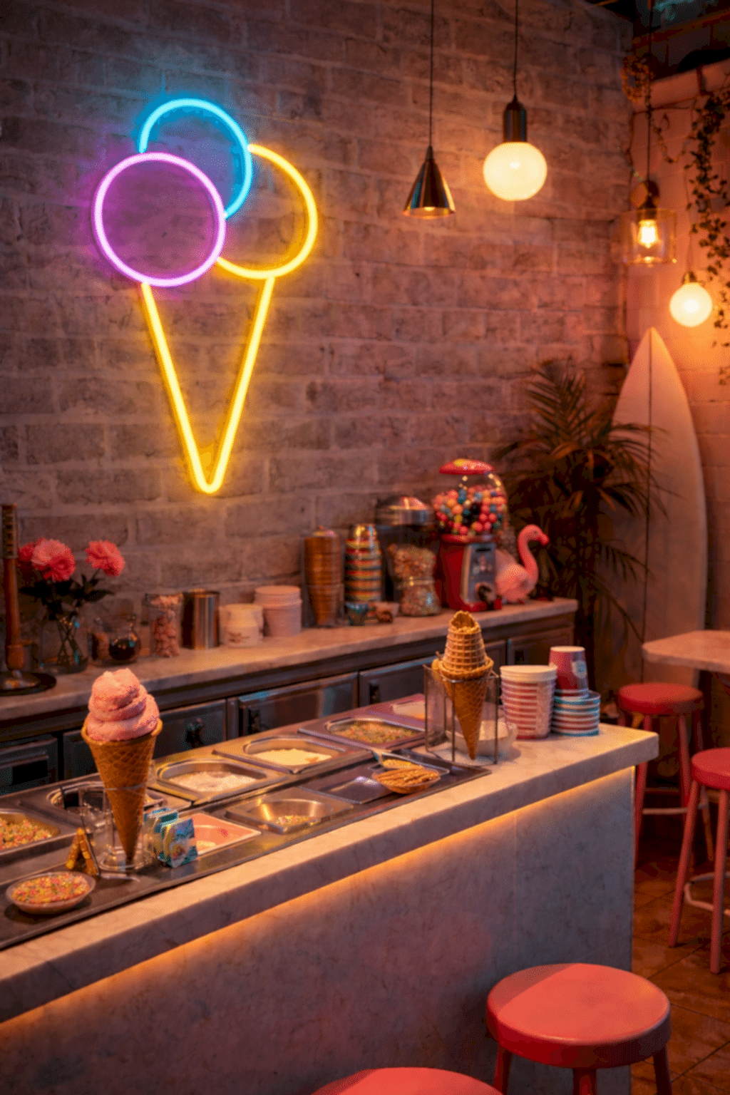 Parlak LED neon ışıkları sayesinde mekânın duvarında güçlü bir görsel odak noktası oluşturur. Özellikle dondurma dükkanları, tatlı barları ve kafe vitrinleri için dikkat çekici bir dekoratif aydınlatma çözümüdür.
