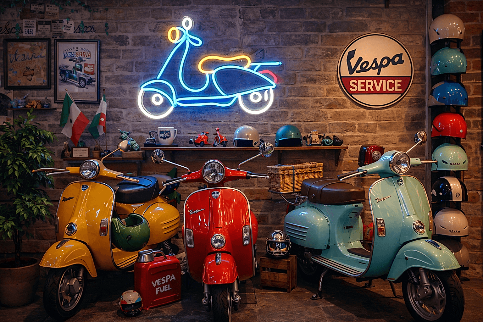 Vespa scooter neon tabela, vintage ve motor temalı dekorasyonlar için dikkat çekici bir duvar dekorudur.
